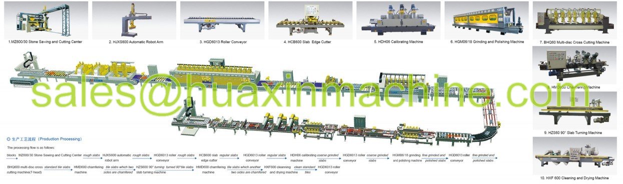 MZ600/30 Stone Sawing and Cutting Center is used to process the specification slabs into mass production. It can finish the automatical operation from sawing the block , cutting off to unloading slabs, which reduces HR cost. MZ600/30 Stone Sawing and Cutting Center consists of HMJ160/30 Gantry Multi-disc Stone Sawing Mahine , HMPQ60 Gantry Level Cutter and HZX120/19 Automatic Slab Unloading Machine.